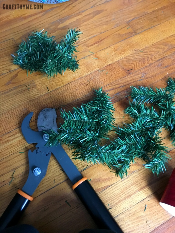 Now here is the fun part. Untie your garland and push in the end until it is near the tree trunk just above the bottom row of branches. Eye ball where the branches end on the piece of garland and then cut that length. Cut 4 or 5 more pieces the same length. Fluff those pieces of garland out and place them right above the bottom row of branches. You can use a piece of the garland to wrap around another branch or the trunk to secure the piece in place.